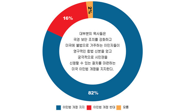 이민법 개정의 구체적인 가이드라인과 관련해, 거의 모든 목회자(98%)가 하나님이 모든 인간에게 주신 신성한 존엄성을 존중하는 입법을 지지한다고 답했다. 또한 대부분은 직계 가족 단위 보호(94%), 법치주의 존중(92%), 납세자에 대한 공정성 보장(90%), 국가 국경 보안 보장(89%) 등의 원칙에도 찬성했다. 목회자의 약 5분의 4(78%)는 일정 자격을 갖춘 불법 체류자에게 시민권 취득 경로를 열어주는 법률에 대해서도 지지했다.