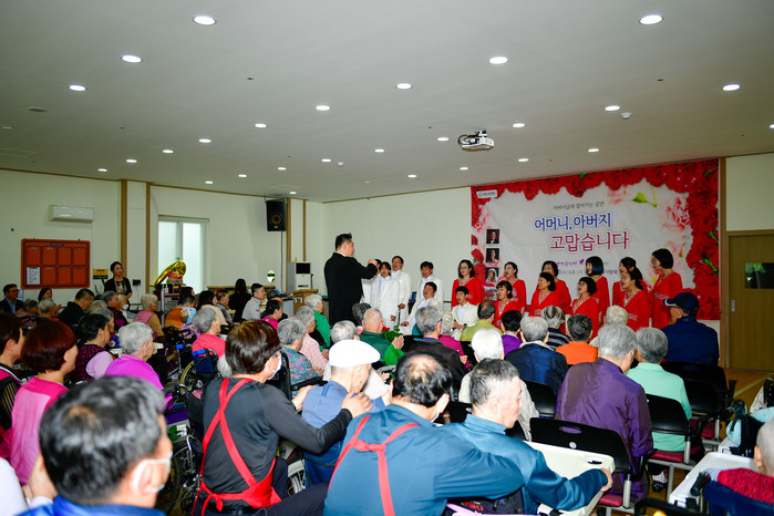 어버이날을 맞이하여 부득히 요양원을 찾지 못하는 자녀들을 대신해 카네이션 꽃을 달아드리고 다양한 노래와 공연으로 어르신들 뿐만 아니라 가족 또는 종사자 모두에게 위로를 전하고자 마련한 효 음악회는 ‘푸른날개합창단(지휘자 정주휘. 피아노 장미라)이 출연하여 1. 인생 2. 우리동네 합창단 3. 로망스(클래식 기타 김남훈) 4. 희브리 노예들의 합창 5. 축배의노래 6. 풍악을 울려라. 7.나 하나 꽃피어 8. 아모르파티 9. 시각장애인 가수 오하라 씨가 출연하여 동백아가씨, 보릿고개 등을 노래했으며 10. 한빛예술단이 특별 출연하여 찐이야! 노래를 신명나는 고고장구 등으로 요양원 어르신들에게 ‘아름다운’ 천상의 하모니 의 공연을 선사했다.