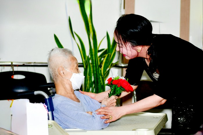 ▲ 김향순 단장이 어르신께 카네이션 꽃을 전해드리고 있다 |