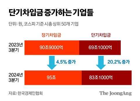 19일 중앙일보가 한국경제인협회(한경협)에 의뢰해 코스피 시가총액 상위 50개 기업(공기업, 금융사 제외) 분기보고서를 분석한 결과, 올 3분기 50개 기업의 만기 1년 미만 단기차입금은 1년 새 20.2% 늘어 83조1180억원에 달하는 것으로 나타났다. 기업들의 전체 외부자금조달에서 단기차입금이 차지하는 비중도 2023년 3분기 17.6%에서 올해 20%로 늘어났다. 같은 기간 50개 기업의 만기 1년 이상 장기차입금은 4.5%(4조692억원) 늘었고, 회사의 성장성을 담보로 일반 투자자들에게 발행하는 회사채는 2% 증가(4조9435억원)하는 데 그쳤다. 단기차입금 비중이 클수록 기업들의 이자 비용 부담도 커진다.