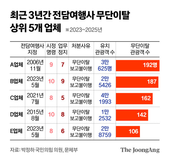 업계에서는 상습적인 제재를 받아도 전담여행사 자격이 유지되는 것이 문제라는 지적이 나온다. 박 의원이 제출받은 자료에 따르면, 최근 3년간 문체부가 지정한 전담여행사 중 무단 이탈 현황 상위 5개 업체는 반복적인 제재를 받았다. 2023년 5월 전담여행사로 지정된 업체는 업무정지 9회, 시정명령 10회를 받았고 2021년 8월 지정된 업체도 업무정지 8회, 시정명령 10회를 받았다.