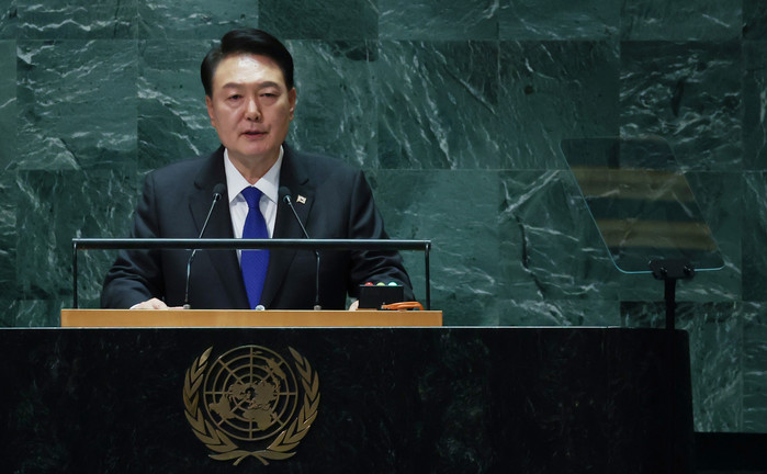 ▲윤 대통령, 제78차 유엔총회 기조연설 미국을 방문 중인 윤석열 대통령이 20일(현지시간) 뉴욕 유엔본부에서 열린 제78차 유엔총회에서 기조연설을 하고 있다. 2023.9.21 |