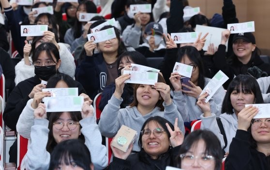 2025학년도 대학수학능력시험(수능) 예비소집일인 13일 오전 인천시 미추홀구 인화여자고등학교에서 수험생들이 밝은 표정으로 수험표를 보여주고 있다. 올해 수능엔 N수생 16만1784명을 포함해 총 52만2670명이 지원했다. [연합뉴스]