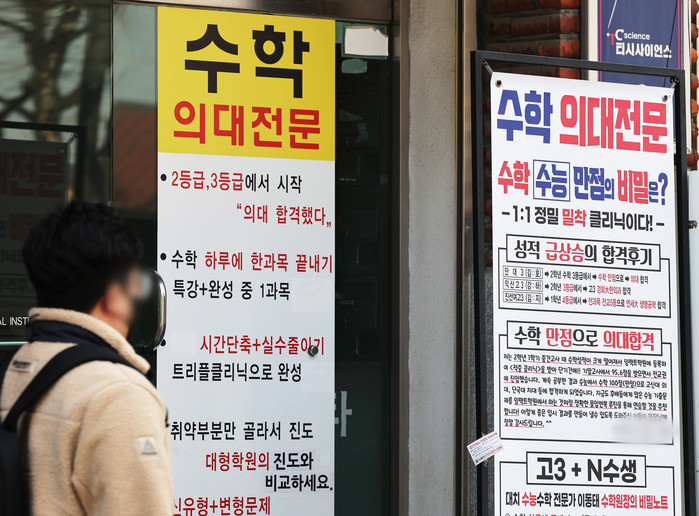 ▲'의대 열풍' 더 거세지나 정부의 전국 의과대학별 정원 배정 결과 공식 발표 예정일인 20일 서울 강남구 대치동 학원가에 의대 전문 홍보문이 붙어 있다. |