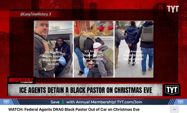 이민세관단속국(ICE) 요원들이 성탄 전야에 한 목사를 강압적으로 연행해 논란이 일고 있다. 메인주 루이스턴(Lewiston)에서 24일 촬영된 영상에는 전술 장비를 착용한 다수의 ICE 요원들이 차량에 탑승해 있던 한 남성과 대치하는 장면이 포착되었다.