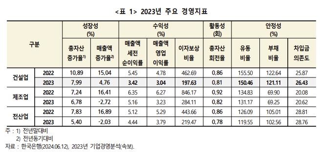 건설업 유동비율(유동자산/유동부채)은 2022년 155.50%에서 지난해 150.46%로 5.04%포인트 하락했고, 차입금 의존도는 같은 기간 25.87%에서 26.43%로 0.56%포인트 상승했다.