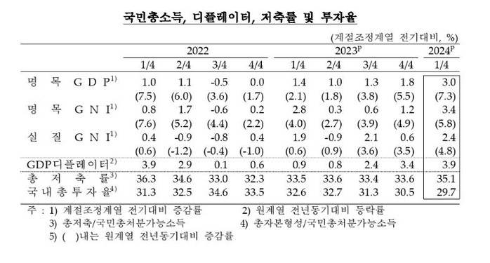 1분기 명목 국민총소득(GNI)은 직전 분기보다 3.4% 증가했다. 명목 국외순수취요소소득이 4조8천억원에서 7조7천억원으로 늘어 명목 GDP 성장률(3.0%)을 웃돌았다.