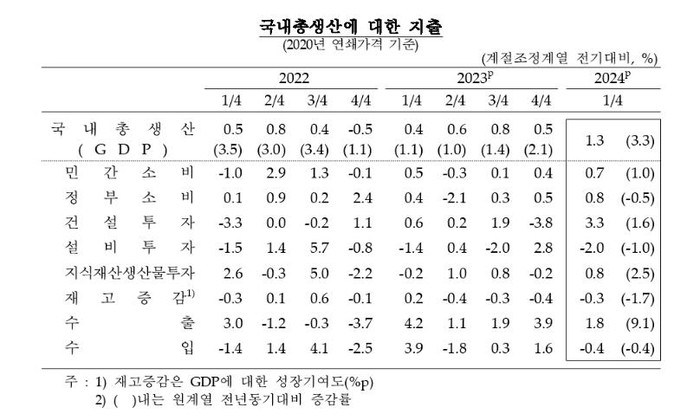 수출 급감과 함께 2022년 4분기(-0.5%) 뒷걸음친 분기 성장률은 지난해 1분기(0.4%) 반등한 뒤 2분기(0.6%), 3분기(0.8%), 4분기(0.5%)와 올해 1분기까지 다섯 분기 연속 플러스(+) 성장 기조를 유지했다.