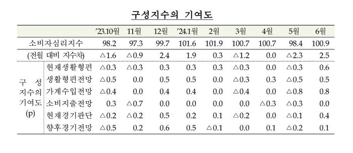 6월 소비자심리지수(CCSI)는 100.9로 전월보다 2.5p 상승했다.
