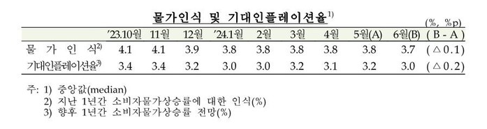 한국은행이 25일 발표한 '소비자동향조사' 결과에 따르면 6월 기대인플레이션율은 전월보다 0.2%포인트(p) 내린 3.0%를 기록했다.