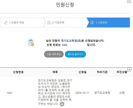 이어 "경기도교육청은 김동연 경기도지사가 극찬한 한강의 『채식주의자』를 조속히 초·중·고 도서관에 다시 배치하고, 청소년 권장도서로 지정해달라"고 촉구했다. 그러면서 경기도교육청으로 민원신청이 완료됐다는 내용이 담긴 화면을 캡처해 올렸다.