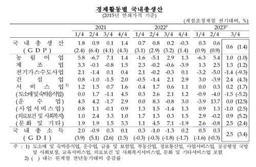 정부소비도 건강보험급여 등 사회보장 현물 수혜 위주로 0.1% 증가했고, 건설투자도 건물건설과 토목건설이 모두 늘면서 2.2% 성장했다.
