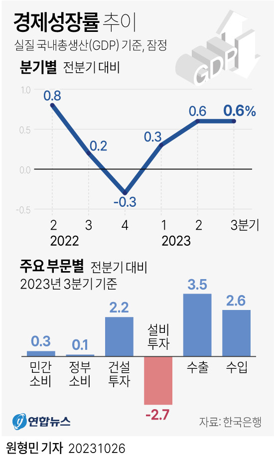 한국은행은 올해 3분기 실질 국내총생산(GDP) 성장률(속보치·전분기 대비)이 0.6%로 집계됐다고 26일 발표했다.