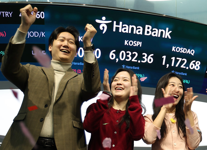 | ▲ 코스피가 장중 6000을 넘어선 가운데 25일 서울 중구 하나은행 본점 딜링룸에서 직원들이 기뻐하고 있다. 2026.2.25 연합뉴스 제공 |