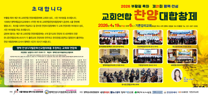 극동방송 평택.안성운영위원회와 평택.안성디지털문화선교협의회(이사장 이명섭 목사. 협의회장 한상옥 장로)는 오는 2026년4월19일(주일)오후6시 경기도 평택시 정암로 164번길(이충동) 기쁜감리교회(담임목사 류승빈/ 031-667-3095,)에서 평택성시화운동본부. 세계투데이. 뉴스컬처. 평택시민신문. 평택자치신문. 평택시사신문. 안성투데이. 뉴웨이넷. 기쁜감리교회가 후원하는 “2026“ 부활절 축하” 제21회 교회연합 찬양대합창제가 열린다.