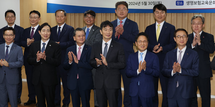 ▲ 금감원장과 보험회사 대표들 이복현 금융감독원장과 보험회사 대표들이 30일 서울 종로구 생명보험교육문화센터에서 간담회 전 기념촬영을 하고 있다. 2024.5.30 |