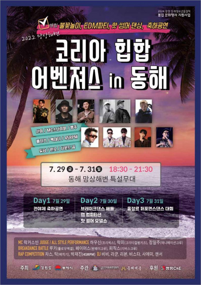 강원 동해시는 29~31일 3일간 '망상해변 코리아 힙합 어벤져스 in 동해'가 망상해변에 준비된 특설무대에서 열린다고 전했다.