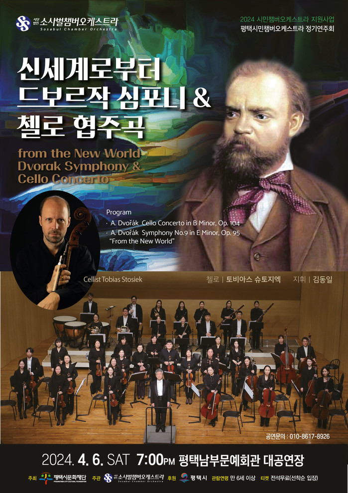 오는 2024년4월6일(토)저녁7시 평택 남부문예회관 대공연장에서 평택문화재단&(사)소사벌챔버오케스트라 주최로 드보르작 교향곡 제9번 '신세계로부터 드보르작 심포니 & 첼로 협주곡이열린다.