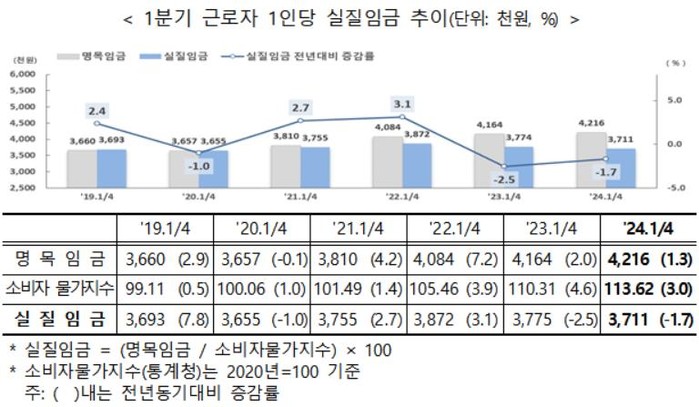3월만 놓고 보면 명목임금은 작년 대비 2.9% 늘고, 실질임금은 0.2% 줄었다.