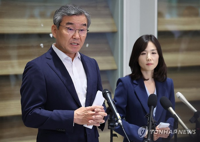 ▲기자회견 진행하는 박성주 국수본부장과 김진아 차관 (영종도=연합뉴스) 김성민 기자 = 캄보디아로 파견된 정부 합동대응팀 단장인 김진아 외교부 2차관(오른쪽)과 박성주 경찰청 국가수사본부장이 18일 인천국제공항 제2터미널로 귀국해 기자회견을 진행하고 있다. 2025.10.18 |