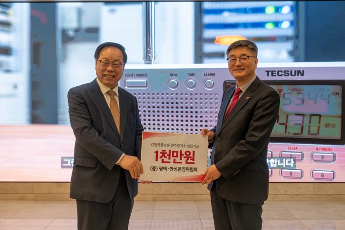 ▲ 서울극동방송 평택.안성위원장 한상옥 장로가 극동방송 맹주완 사장에게 강원극동방송 원주중계소 설립기금을 전달하고 있다. |