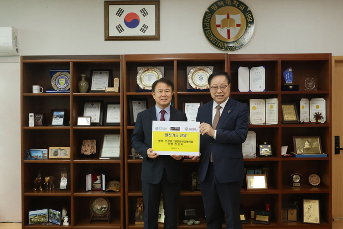 ▲ 서울극동방송 평택.안성위원장 한상옥 장로가 평택대학교 이동현 총장에게 발전기금을 전달하고 있다. |