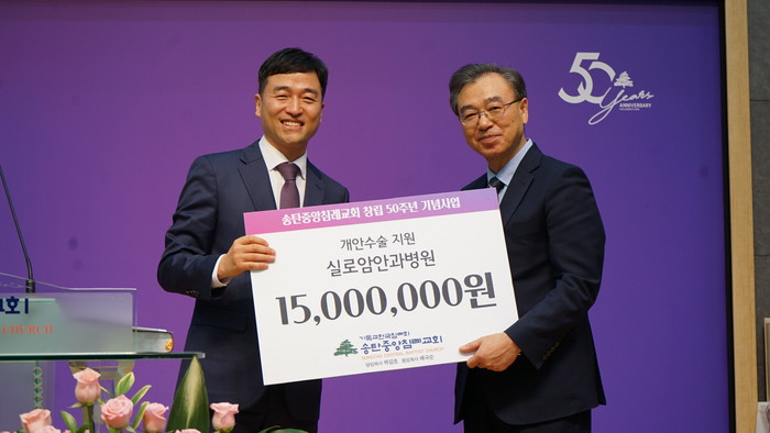 끝으로 사랑의 나눔 시간에 교회창립 50주년 기념주일을 맞이하여 지역사회와 어려운 이웃을 위한 개안수술비를 실로암 안과 원목 성기복 목사에게 50명분 일천오백만원을 전달했으며 박길호 담임목사의 축도로 교회창립 50주년 기념예배를 마쳤다.