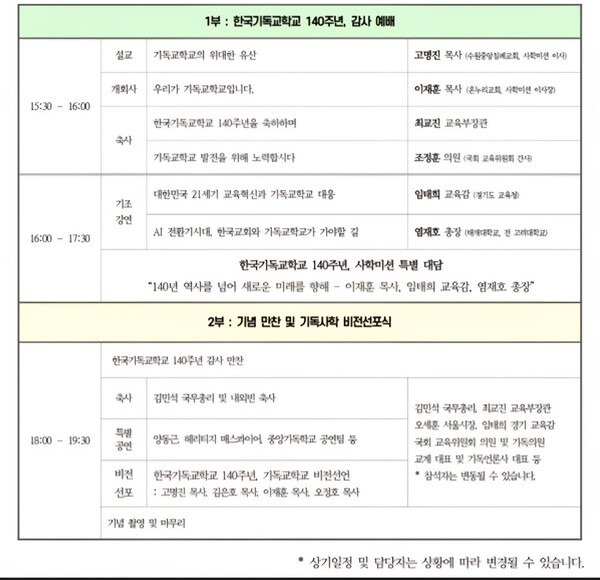 이번 콘퍼런스는 140주년 감사 예배로 시작되며, 고명진 목사(수원중앙침례교회)가 설교를 맡아 한국기독교학교의 건학정신과 교육 선교의 의미를 조명할 예정이다. 이어서 임태희 경기도 교육감과 염재호 태재대학교 총장이 각각 기조강연을 통해 기독교학교가 새 시대에 감당해야 할 교육 혁신과 미래 전략을 제시한다. 또한 이재훈 목사, 임태희 교육감, 염재호 총장이 함께 하는 사학미션 특별대담이 진행되어, 급변하는 시대 속에서 한국교회와 기독교학교가 나아가야 할 방향을 심도 있게 논의할 예정이다.
