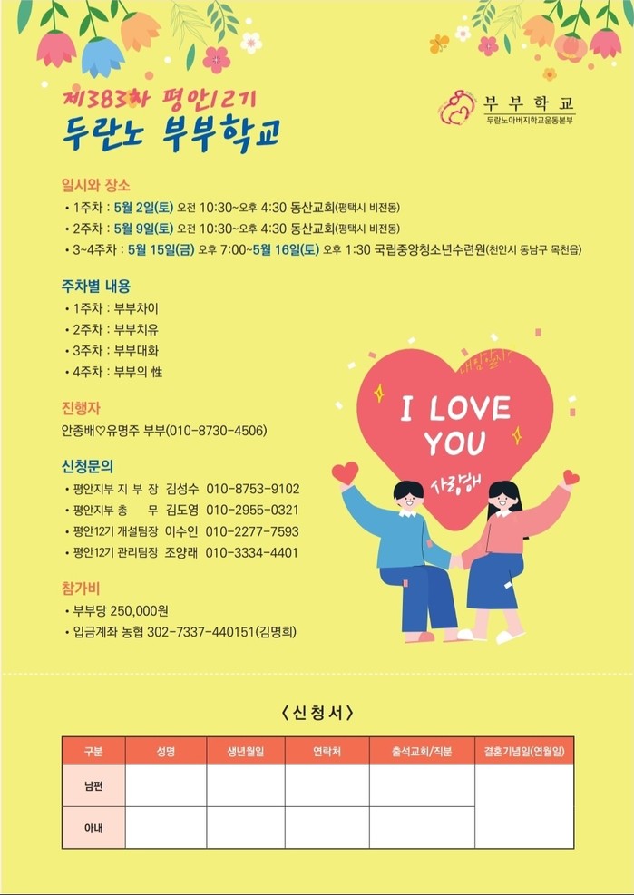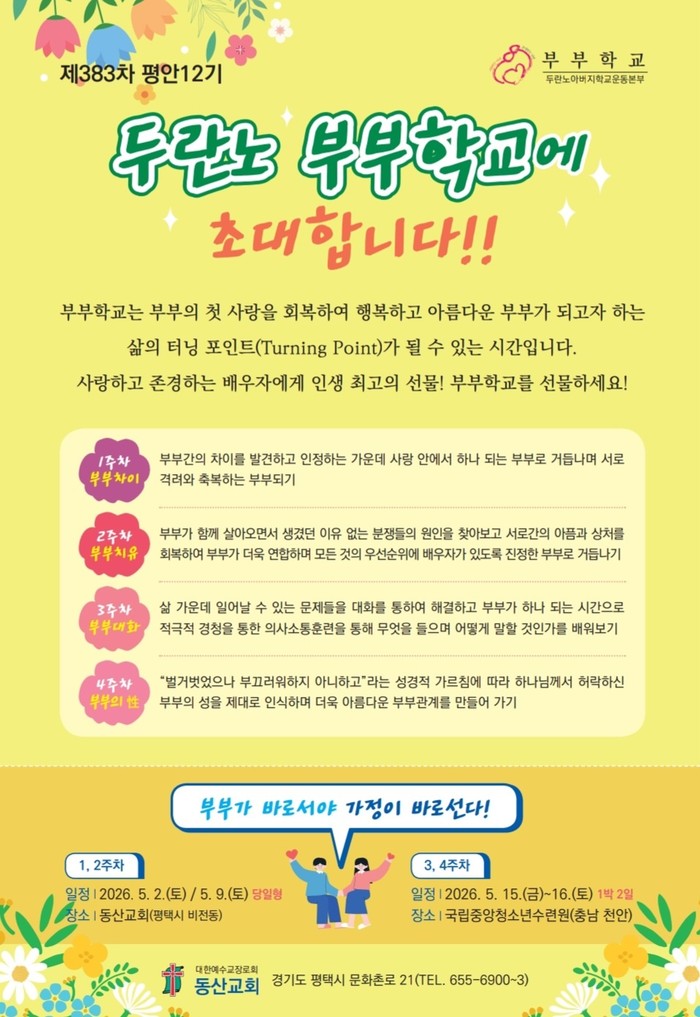 두란노아버지학교운동본부 평안지부(김성수 장로)와 평택동산교회(원로목사 이춘수. 위임목사 차성수)는 2026년 5월2일부터-16일까지 3주간 평택동산교회에서 5월 가정의 달에 맞추어 두란노 부부학교를 개설한다.