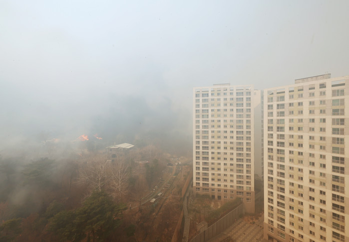 | ▲ 25일 울산시 울주군 언양읍에서 난 산불이 확산하면서 인근 아파트까지 불길이 접근하고 있다. 2025.3.25 연합뉴스 제공 |
