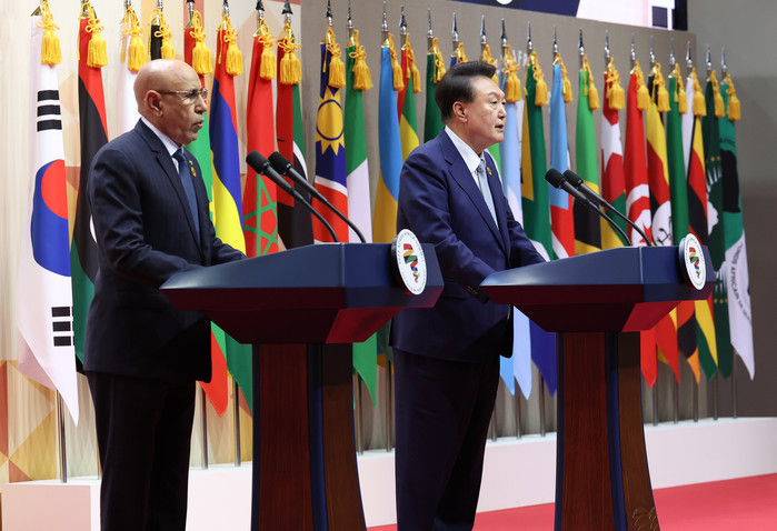 | ▲ 윤석열 대통령과 아프리카연합(AU) 의장국 무함마드 울드 가주아니 모리타니아 대통령이 4일 경기도 고양시 킨텍스에서 '2024 한-아프리카 정상회의 공동언론발표'를 하고 있다. 연합뉴스 제공 |