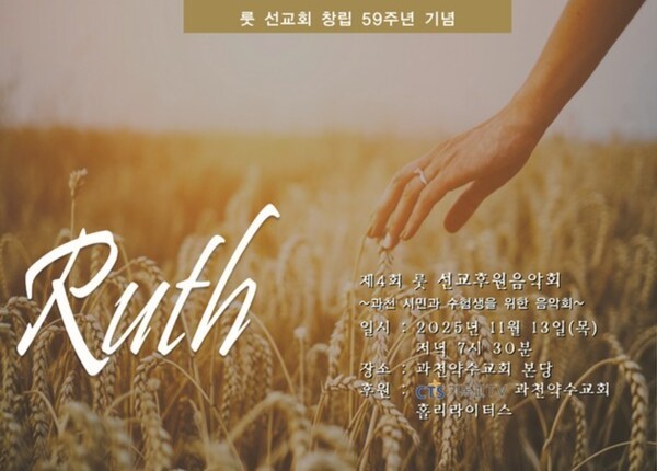 룻선교회(회장 석태임)는 창립 59주년을 맞아 오는 11월 13일(수) 오후 7시 30분, 경기 과천약수교회 본당에서 제4회 ‘룻 선교후원 음악회’를 개최한다. 이번 음악회는 복음의 빛을 따라 걸어온 선교회의 발자취를 돌아보고, 음악을 통해 다시금 선교의 열정을 일깨우는 시간을 마련하고자 기획됐다.