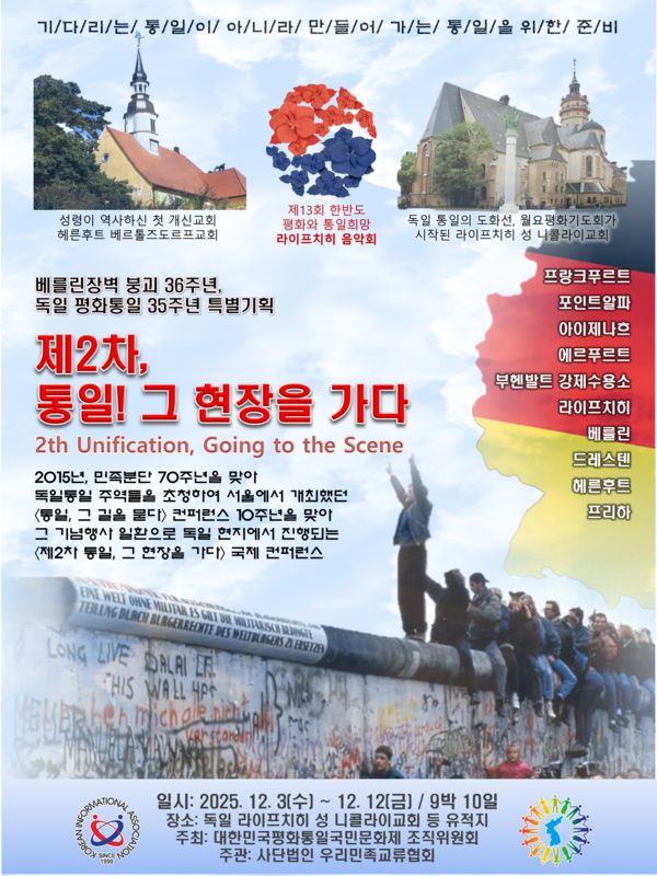 민국 평화통일 국민문화축제 조직위원회(주최)와 사단법인 우리민족교류협회(주관)는 베를린 장벽 붕괴 36주년 및 독일 통일 35주년을 기념하는 특별 기획으로 '제2차, 통일! 그 현장을 가다' 컨퍼런스를 개최한다고 밝혔다. 이번 행사는 "기/다/리/는/가/, 통/일/이/ 아/니/라/ 만/들/어/가/는/ 통/일/을/ 위/한/ 준/비"라는 슬로건 아래, 분단 극복의 현장인 독일 라이프치히 등지에서 진행된다.