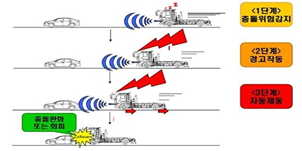 ▲  자동비상제동장치 작동 원리 국토교통부는 광역ㆍ시외버스 충돌사고를 방지하기 위해 비상자동제동장치의 장착을 지원하는 보조금 업무처리지침을 마련했다.
