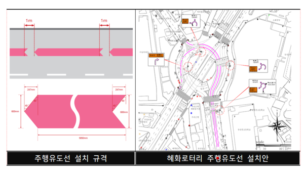 이에 주행유도선 확대설치를 위하여 비정형교차로 등 주행방향을 혼동하기 쉬운 지점을 전수조사 하였고, 현장점검을 통해 혜화로터리 등 20개소를 대상지로 선정했다.
