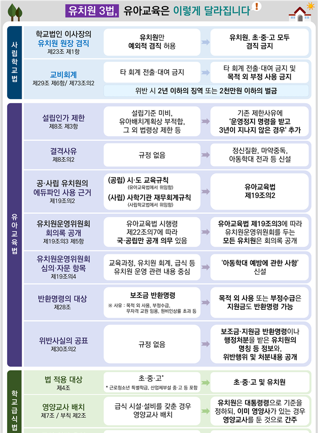 한편 유은혜 부총리는 “유치원 3법이 통과됨으로써 사립유치원 회계의 투명성 강화를 위한 기틀이 마련된 것을 환영한다.”라고 밝히고, “교육부는 앞으로도 사립유치원이 학교로서 정체성을 확립하고 학부모 신뢰를 회복할 수 있도록, 이번 개정 법률에 따라 앞으로도 공공성 강화를 지속적으로 추진해 나가겠다.”라고 강조했다.